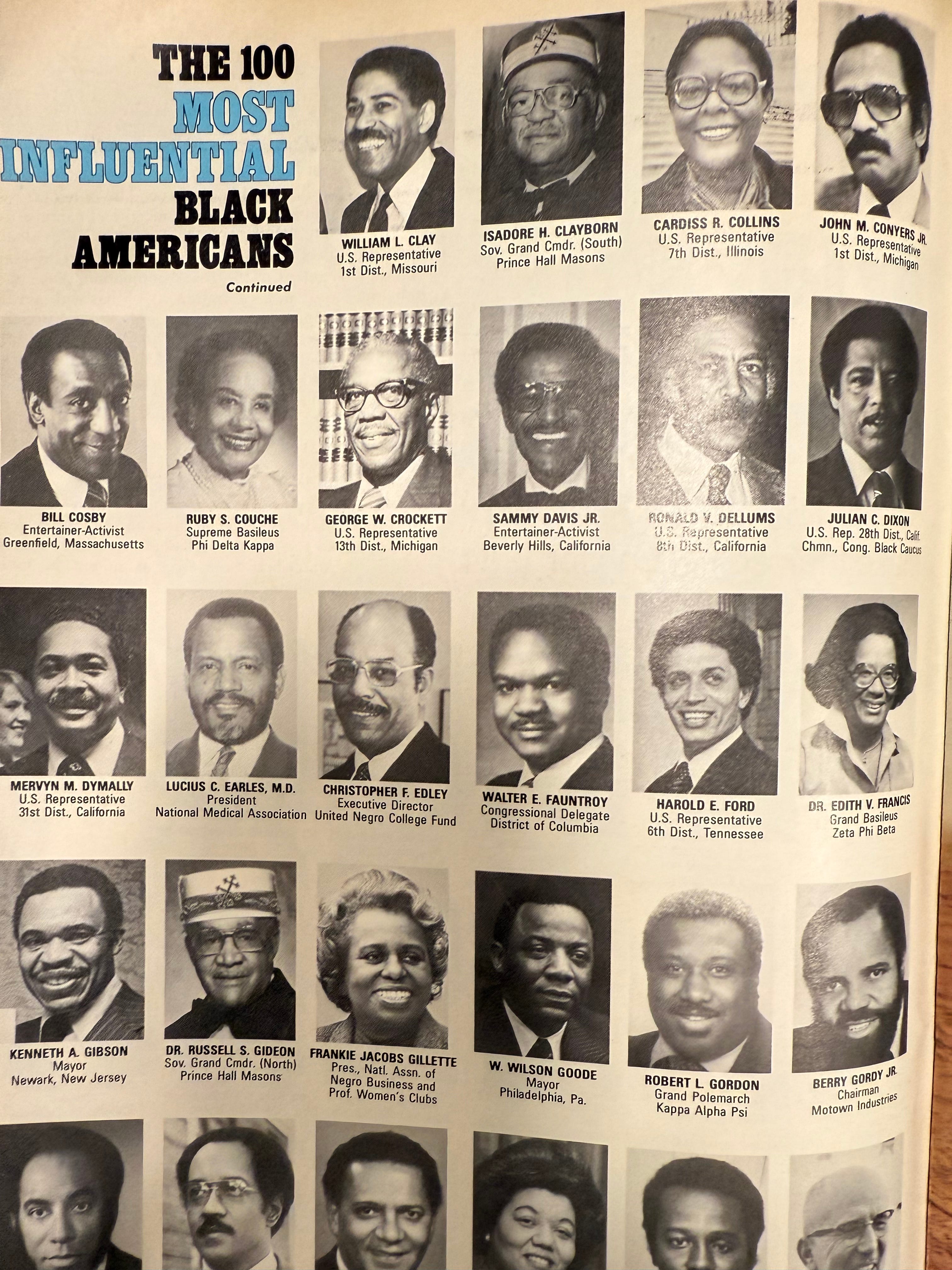 I recently found a May 1984 edition of Ebony in box of Michel Jackson memorabilia my wife had been saving. In that edition is also that year’s 100 Most Influential list. The contrast could not be more striking. A full 25% of the list is occupied by the sitting Congressional Black Caucus members. Appropriately, the Rev. Jesse Jackson, who had just finished a historic run for president, was on it. There are a few well-known entrepreneurs (John H. Johnson, Earl Graves, George Johnson, John Sengstacke) and a handful of corporate executives. But the bulk of the list is made up of people who ascended to prominence and official roles in the post-civil rights 70’s —mayors of big cities, military leaders, heads of major Black church denominations, state legislators and federal judges (Thurgood Marshall was still on the Supreme Court) and the heads of historic black organizations, leaders of the Divine Nine and the major professional groups, and deeper into the fabric, the Sovereign Grand Commander of the Northern Prince Hall Masons, the Imperial Potentate of the Mystic Shrine, the Grand Exalted Ruler of the Elks and the president of the National Association of Colored Women’s Clubs.